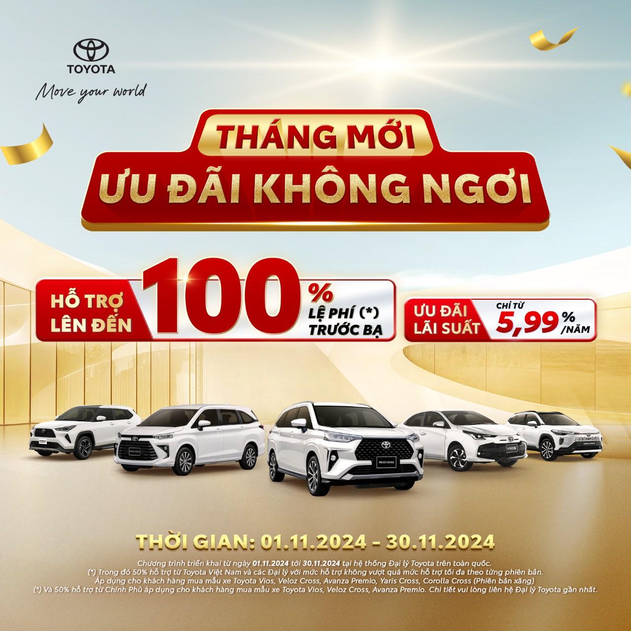 Khởi động tháng 11, Toyota Việt Nam và Toyota Từ Sơn tiếp tục đồng hành và mang đến những ưu đãi hấp dẫn, giúp Quý khách hàng tối ưu chi phí sở hữu các mẫu xe bán chạy hàng đầu Vios, Yaris Cross, Veloz Cross, Avanza Premio và Corolla Cross (phiên bản Xăng):​