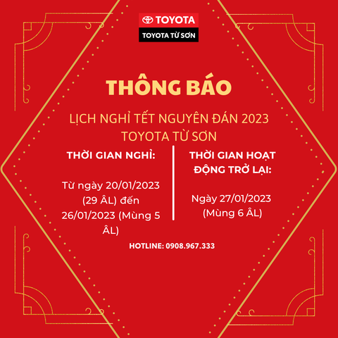 Toyota Từ Sơn xin gửi tới Quý Khách hàng và Quý đối tác lịch nghỉ Tết Nguyên Đán 2023 như sau: - Thời gian nghỉ: Từ thứ Sáu, ngày 20/01/2023 (29...