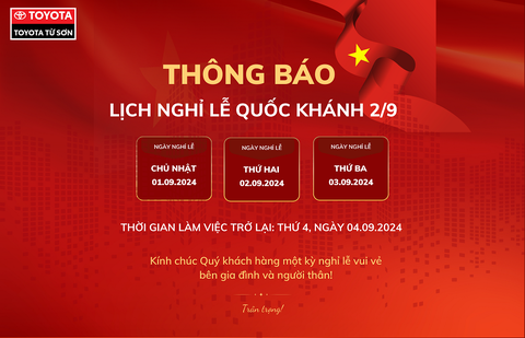 Toyota Từ Sơn chân thành cảm ơn sự ủng hộ của Quý Khách hàng và Đối tác trong thời gian vừa qua. Chúng tôi xin trân trọng thông báo lịch nghỉ Lễ Q...