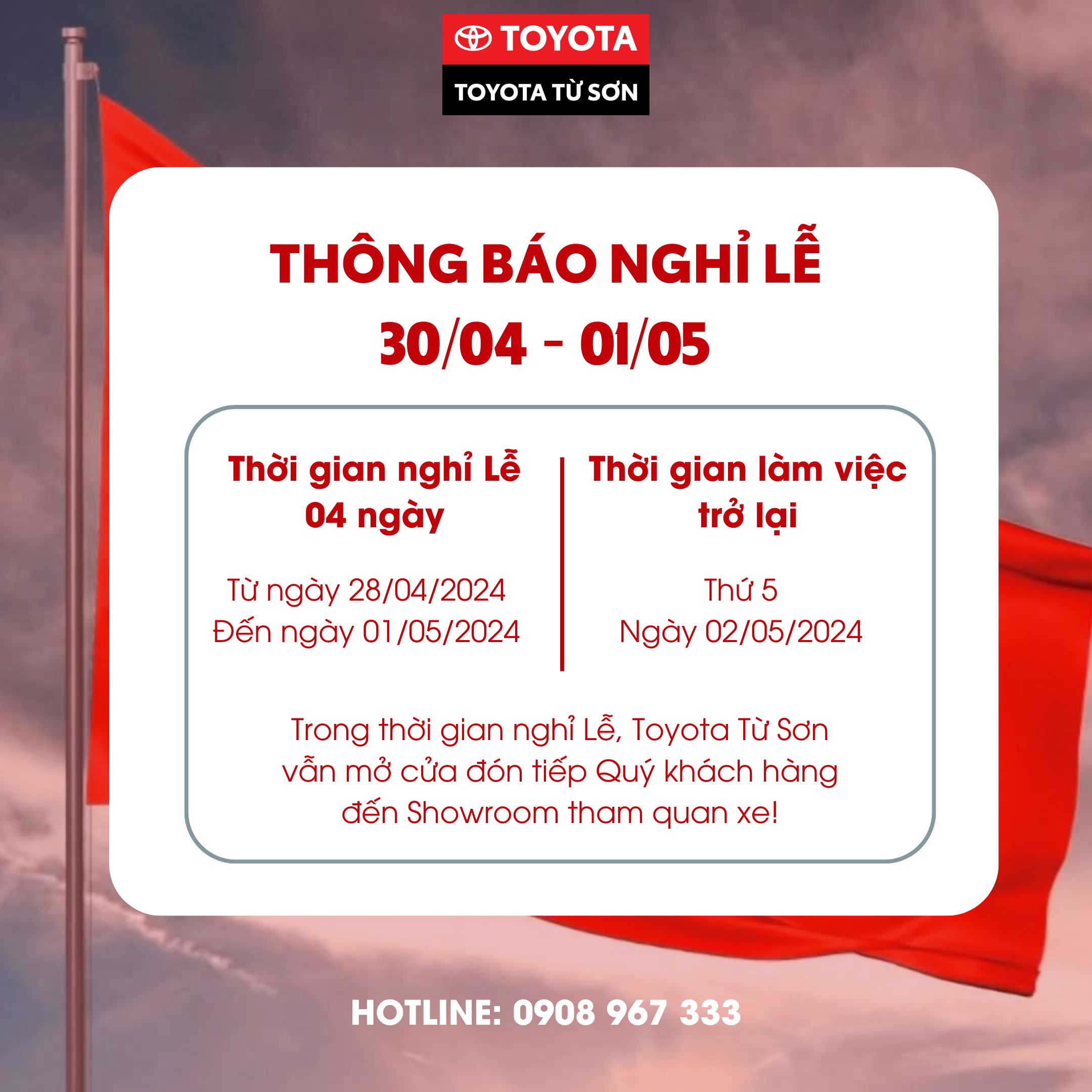 TOYOTA TỪ SƠN THÔNG BÁO LỊCH NGHỈ LỄ 30/04 & 01/05